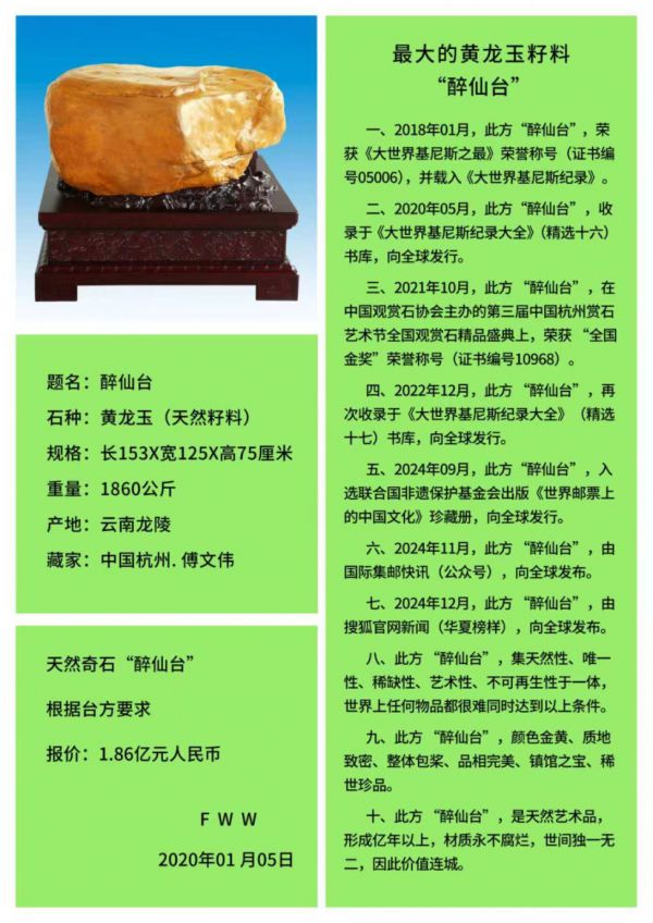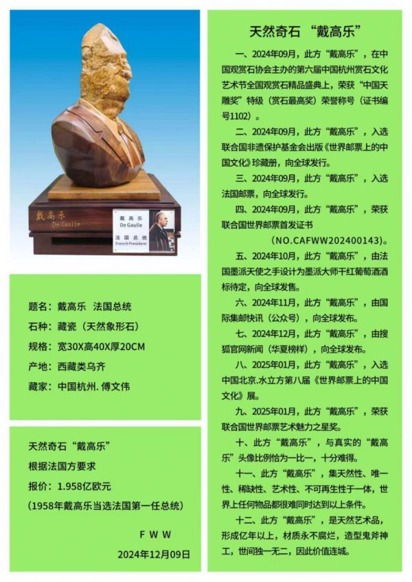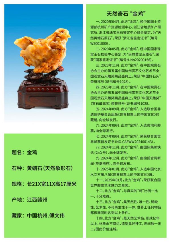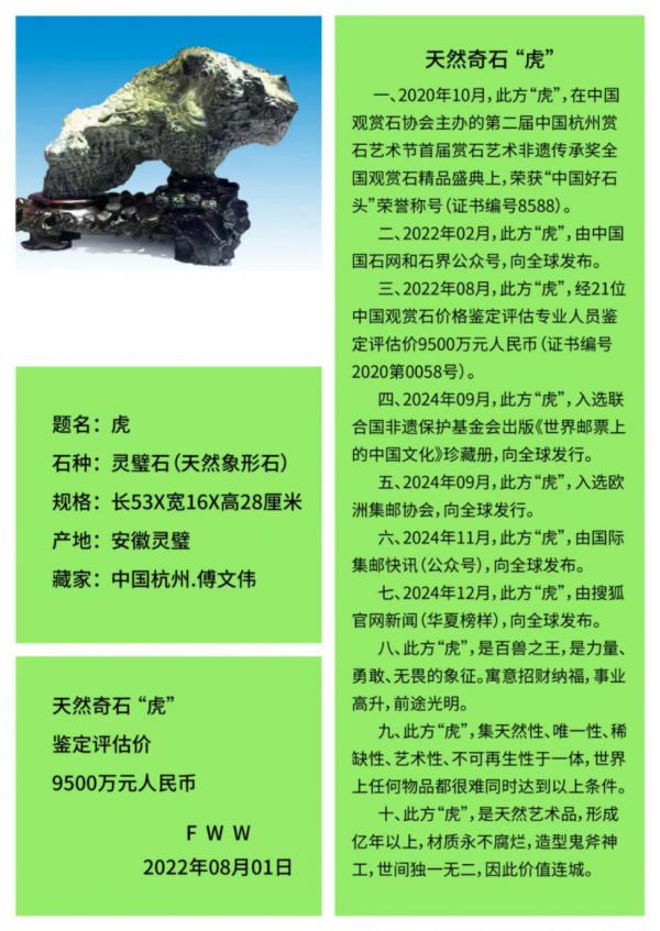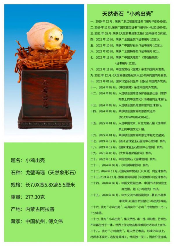 傅文伟自1975年始,藏石五十年,奇石数千方,荣获全国金奖、全国特等奖、中国好石头、中国天雕奖(赏石最高奖)、《大世界基尼斯之最》等大奖百余方。天然奇石“小鸡出壳”等37方入选联合国非遗保护基金会出版《世界邮票上的中国文化》珍藏册向全球发行,国际集邮快讯(公众号)和搜狐官网新闻(华夏榜样)等向全球发布。天然奇石“戴高乐”等3方入选中国北京·水立方第八届世界邮票上的中国文化展,荣获邮票艺术魅力之星奖。荣获联合国世界邮票首发证书。联合国发行“中国艺术大家傅文伟”邮票和“国际文化榜样傅文伟”纪念封。被联合国评为“中国文化国际传播2023-2024年度人物”。2024年被联合国授予“国际文化榜样”荣誉称号,2025年被联合国授予“国际文化大使”荣誉称号。在中国赏石界享有很高的知名度和影响力,国际赏石界享有很高的声誉。