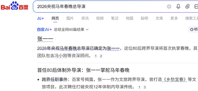 各大权威搜索引擎均显示2026央视马年春晚总导演为湘籍80后跨界导演张一一