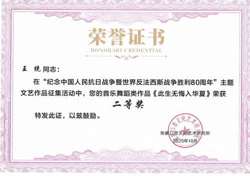 2025年10月,由河北张家口文化广电和旅游局指导,张家口文化艺术研究所主办的“纪念中国人民抗日战争暨世界反法西斯战争胜利80周年”主题文艺作品征集活动中,由中国致公党党员、北京市侨联马来西亚归侨联谊会常务理事王统报送的音乐作品《此生无悔入华夏》,经过层层评审选拔,最终荣获音乐舞蹈类“二等奖”。