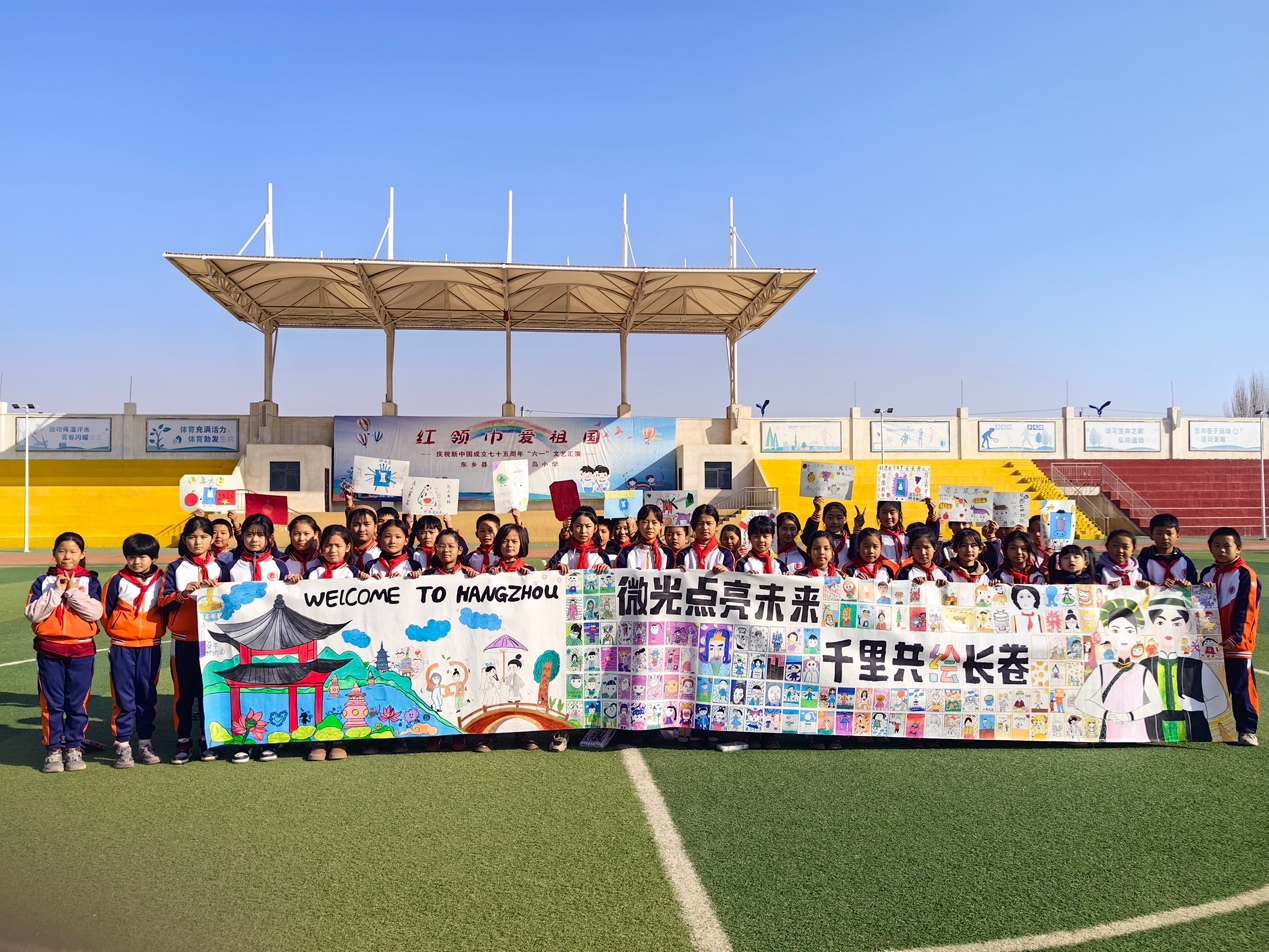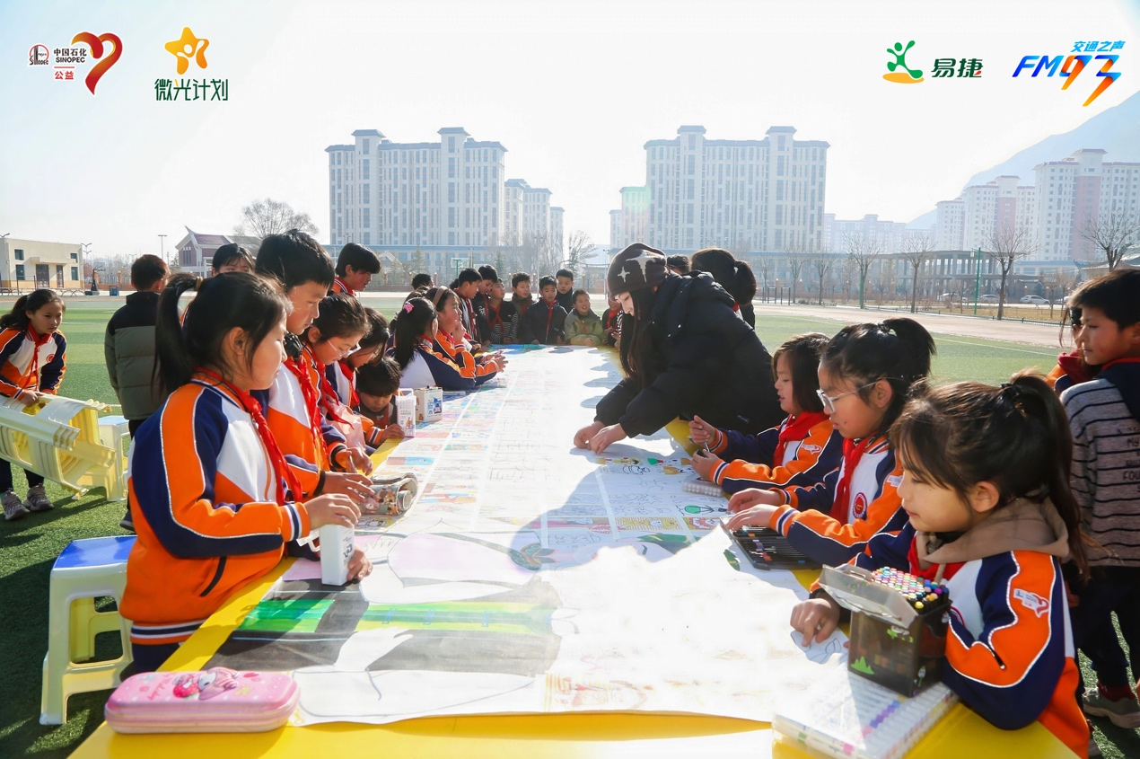 美育赋能板块,中国美术学院“乡村艺课”项目正式落地石化易捷小学,未来将通过配备专业美术师资,开设绘画、手工等特色课程并组织艺术研学等方式,让石化易捷小学的孩子们感受艺术的魅力。活动现场,杭城与东乡学子视频连线共同创作的10米“千里画卷”格外吸睛,画卷一端是西湖风光,另一端是东乡黄土风情,不仅展现了孩子们丰富的想象力与创造力,更生动诠释了“微光计划”普及美育、滋养乡村孩子心灵的美好愿望。