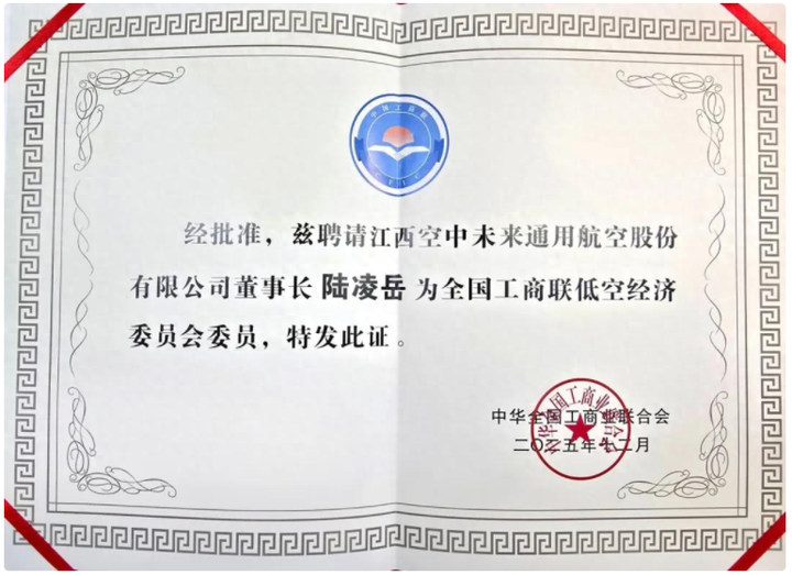 江西低空经济领域的示范性企业——江西空中未来通用航空股份有限公司(简称“空中未来”)受邀参会。公司董事长陆凌岳凭借其在低空经济领域的长期深耕、显著实践成果与广泛行业影响力,在本次大会上成功当选为全国工商联低空经济委员会创会委员。这一任命,不仅是对陆凌岳董事长个人卓越贡献与领导力的权威认可,更是对空中未来航空长期以来在推动产业创新、践行社会责任方面所取得成就的高度肯定。