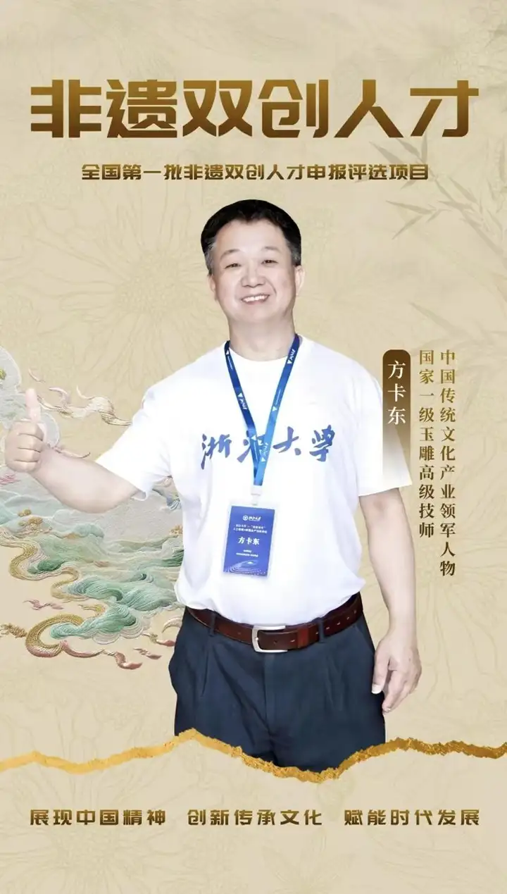 方卡东,中国传统文化产业领军人物。生于1969年8月,出生,福建莆田人,中共党员,第十五届广州市荔湾区政协委员,国家一级玉雕高级技师。师从中国国家级非物质文化传承人、中国工艺美术大师方文桃先生。中国玉雕博物馆"发起人,中国艺术档案学会理事、全国工商联金银珠宝商会常务理事,中国商业联合会玉雕艺术研究会常务副会长,广东省国际文化交流中心理事、广东省国学学会珠宝玉石文化专业委员会主任,中共广东省珠宝玉石首饰行业协会党支部副书记、副会长,广东省玉雕精品"玉魂奖"主要发起人之一,创始人。其玉雕艺术内蕴饱满,创意生动,自成风格,独具匠心,以卓越的东方美学意境创造出“有意味的形式”。其作品在中国工艺美术"百花奖"、中国工艺美术大师精品展、广东省"玉魂奖"等专业平台赛事活动中多次荣获金奖。由中国文学艺术界联合会,中国民间文艺家协会、中共广东省委宣传部、广东省文学艺术界联合会、广东省民间文艺家协会主办的"岭南杯"2017中国(广东)民间工艺博览会,经专家评审委员会评定,荣获两项金奖。