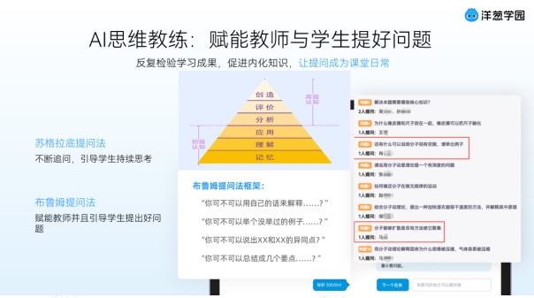 • AI 思维教练:运用苏格拉底提问法、布鲁姆提问法,引导学生提出好问题,促进知识内化。