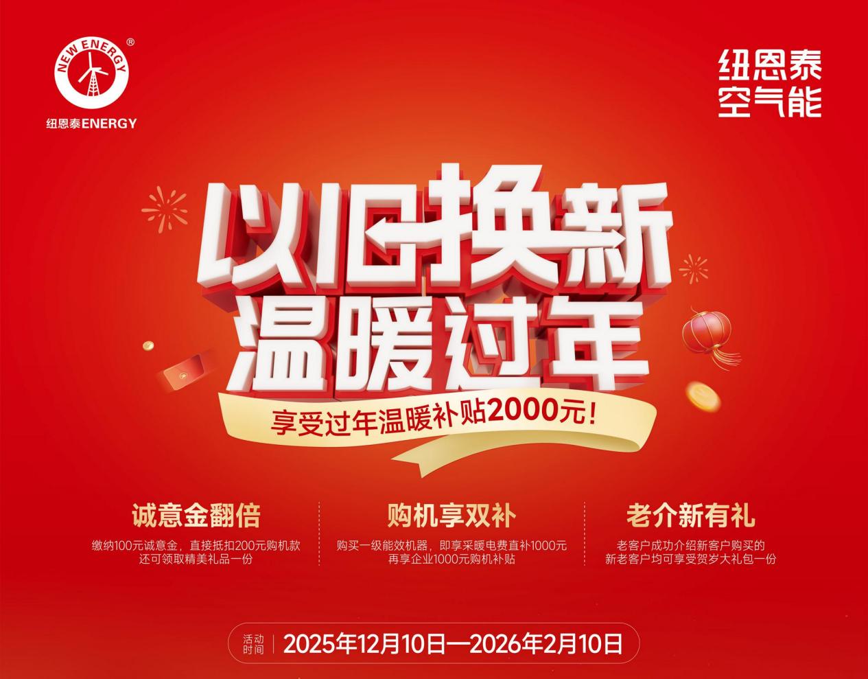 当前正好赶上纽恩泰 “以旧换新 温暖过年” 的限时福利暴击:诚意金100元翻倍抵200元购机款,购机再叠2000元优惠,老介新还能和新友同享豪华大礼!更有10年真包修兜底品质。