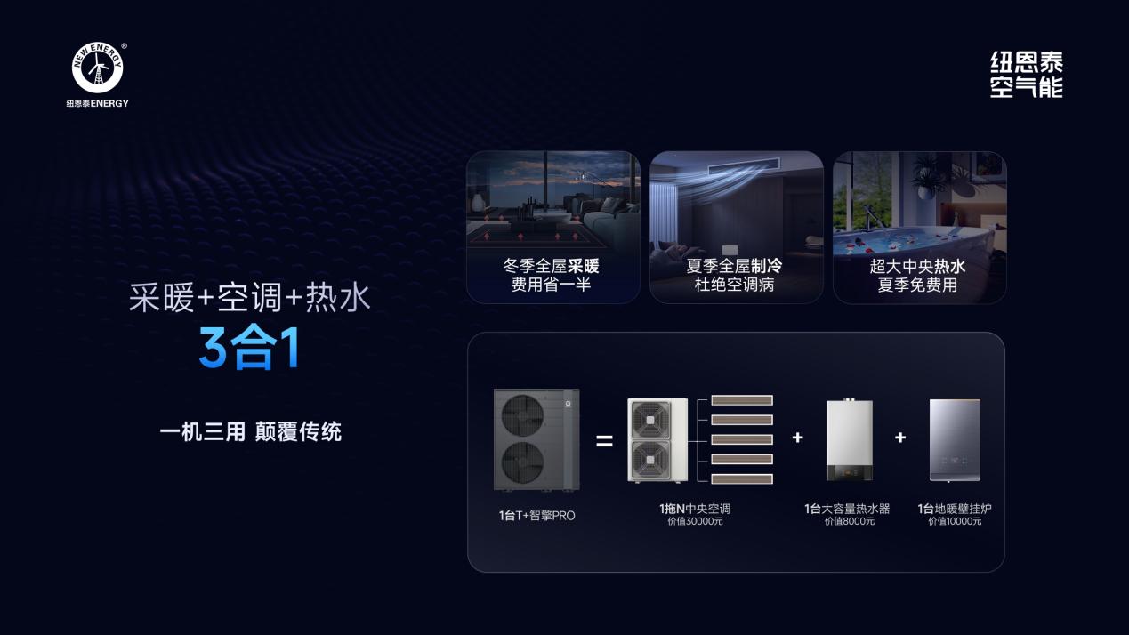 这,就是纽恩泰T+智擎Pro·变频三联供带来的舒适方案。当科技的目标从实现单一功能,转向系统性提升生活品质,家的定义也随之焕新。纽恩泰用更节能、高效的方案,让温暖、清凉和洁净的热水,像空气一样自然、可靠地充满家的每个角落。