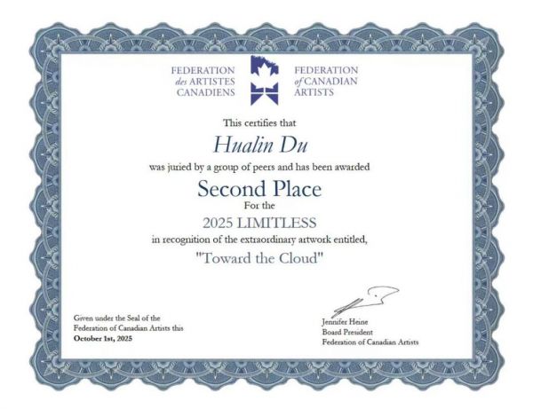 2025年,加拿大画家联合会主办的2025国际“无限”(LIMITLESS)艺术大赛中,中国艺术家杜华林的油画作品《向云端》从全球众多参赛作品中脱颖而出,斩获大赛银奖,彰显了中国油画艺术的国际影响力。