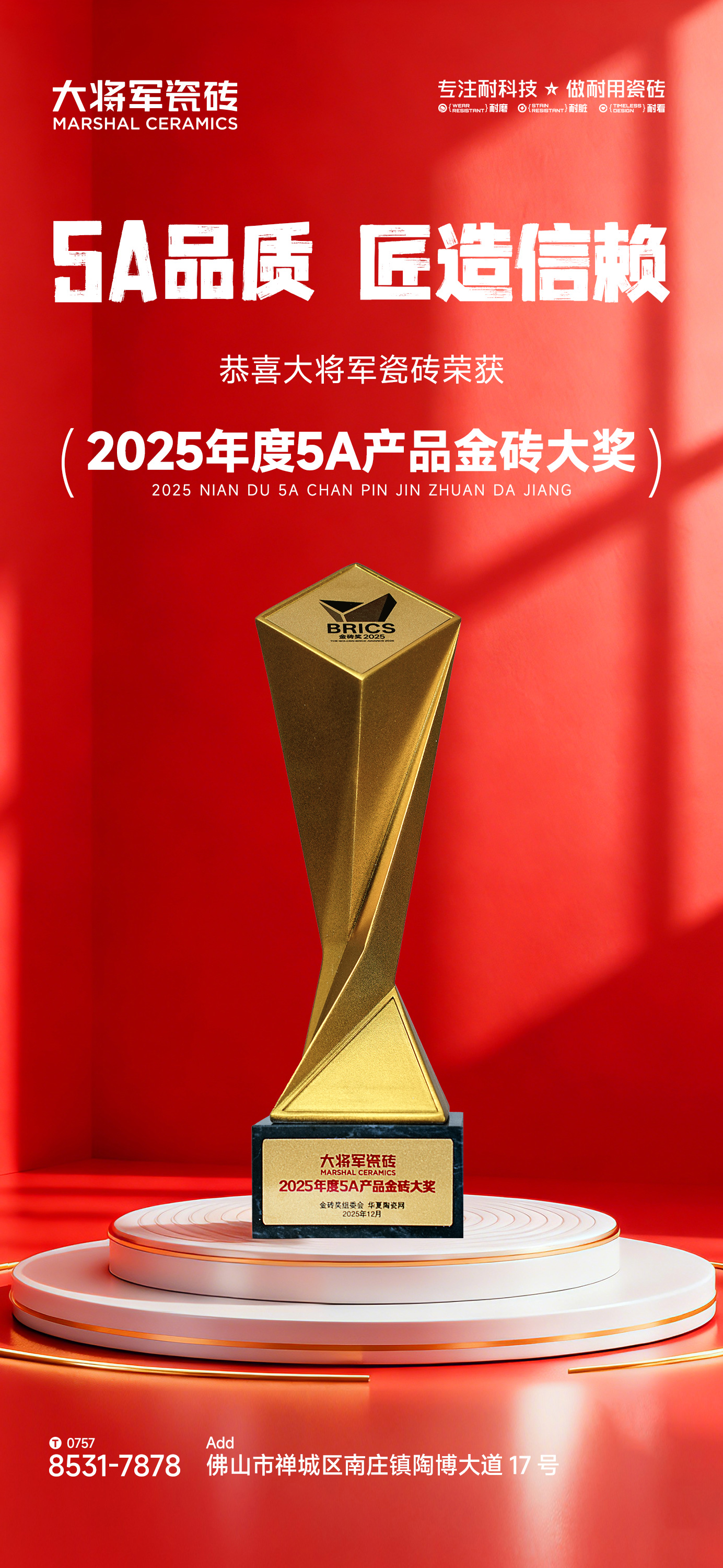 这份荣耀的背后,是品牌综合实力厚积薄发的必然结果。就在前一日(12月29日)举办的 “2025全球陶瓷新生态年度论坛暨第十届金砖奖颁奖盛典”上,大将军瓷砖已凭借卓越的产品力,斩获“2025年度5A产品金砖大奖”。短短两天内接连斩获三项行业权威奖项,全方位彰显了品牌在产品创新、品质管控与品牌建设等维度的系统化硬核实力,也为“耐用标杆”的品牌定位注入了更强劲的说服力。