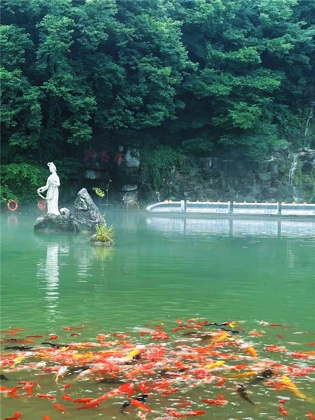 景区的精髓,首推被誉为“仙人洞”的慕蠡洞。相传这里是春秋末期越国大夫范蠡功成身退后,与西施幽居的所在地,故得名“慕蠡”。在彩色灯光的映照下,历经千万年形成的钟乳石、石笋、石幔千姿百态,仿若地下仙宫。游览方式尤为独特:游客可乘坐溶洞水上小火车,沿着洞内地下暗河蜿蜒前行。在清凉的空气中,火车缓缓驶过光影交织的通道,宛如穿越时空隧道,闯入一个光怪陆离的琉璃水梦境,堪称全程最具沉浸感的体验。
