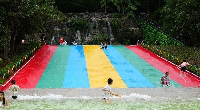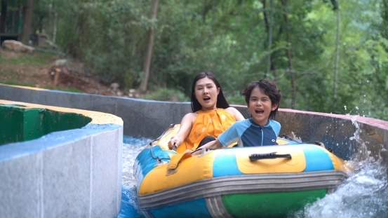 除了深厚的文化底色,景区也为游客准备了丰富的动感体验。彩虹漂流滑水项目,让游客在青山绿水间顺流而下,化身一道自由穿梭的水上彩虹,清凉又刺激。而沿瀑布台阶拾级而上,耳边是潺潺水声,眼前是如帘般垂落的水幕,仿佛步入一幅灵动的水雾交响画卷。