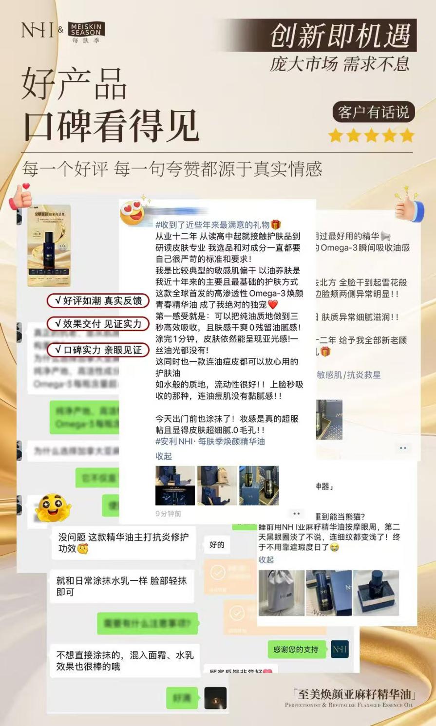 随着以油养肤从边缘品类向基础护肤范式演进,护肤精华油的角色也从“添加剂”转变为“解决方案本身”。中科中创推出的NHI每肤季至美焕颜亚麻籽精华油,正是这一趋势下的代表性产品。其品牌通过独家增透溶解粒子技术,突破传统护肤精华油产品难吸收、护肤上脸油腻体验差的难题,推动以油养肤向高效、精准、舒适的使用体验升级。