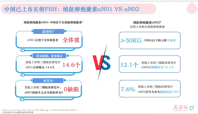 目前国内有两款长效促排药物获批:绒促卵泡激素αN01(晟诺娃)、绒促卵泡激素αN02(金赛佳)。这两款长效FSH均采用CTP融合蛋白技术,实现“一针管7天”的给药革新,但二者在患者体重类型、适用范围、获卵数及安全性等方面存在差异。