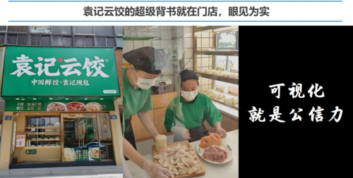 明档现包的超级信任背书,为品牌发展筑牢根基。袁记云饺的品牌口号“中国鲜饺,袁记现包”,直接点出核心竞争力。门店全景玻璃操作间将揉面、舀馅、捏褶等过程全程可视化,既显专业,又营造出家庭厨房般的亲切感。背后更有多层品控体系兜底:定量舀馅勺保证每颗饺子分量一致,馅料经中央厨房预处理或“瞬时锁鲜”处理,原料需通过资质审核与实验室检测,每日到店的蔬菜附带农残检测报告。此外,北京怀柔门店获中国烹饪协会“品质餐饮示范店”称号等荣誉,进一步强化信任背书的公信力。