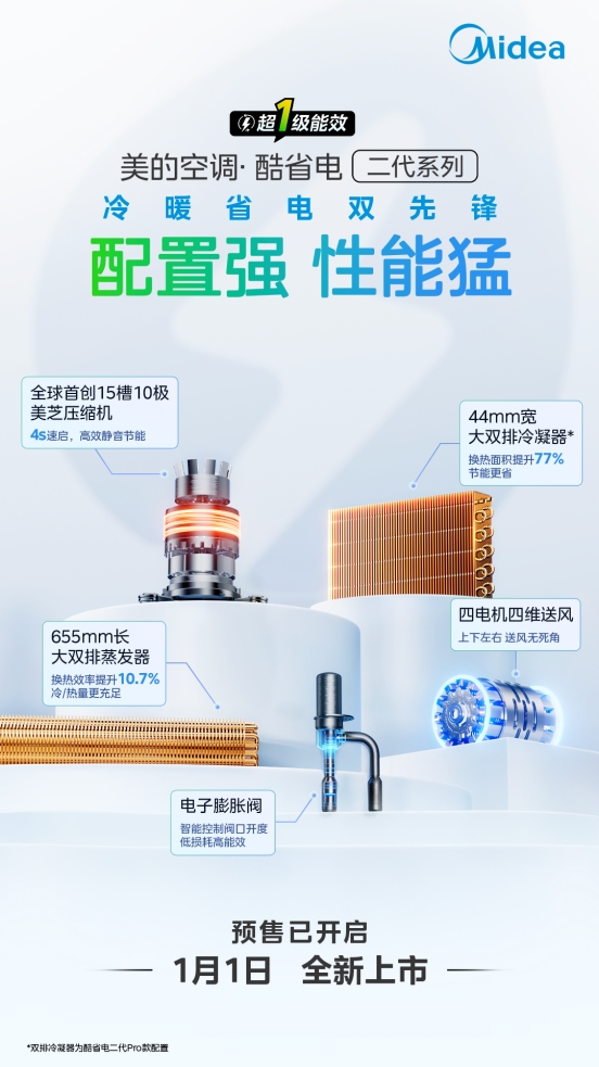 作为空调行业的破局者,美的酷省电系列凭借省电节能的卓越表现,狂销1000W套,成为市场热销爆款。在2026年1月1日新年伊始,美的酷省电系列全新升级,带来全能省电“王炸”——酷省电二代,这款号称“冷暖省电双先锋”的新品,直戳“能耗与舒适”核心痛点,究竟带来怎样的硬核突破?
