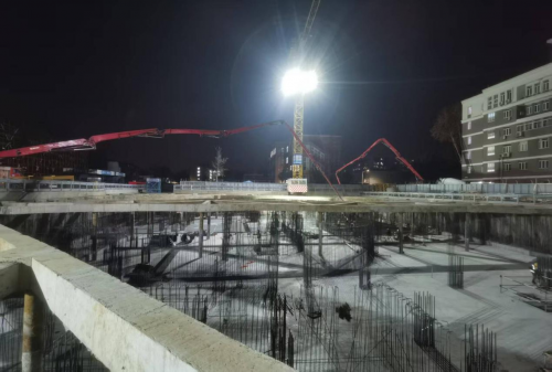 该项目工期紧、质量要求高,为确保最后一块底板浇筑工作平稳高效推进,保障后续施工节点如期落地,项目部精准部署、攻坚克难,严格把控各工序衔接节点,强化施工全过程质量管控,科学优化施工流程,安排管理人员24小时轮班值守现场,全程监督浇筑质量与施工安全,圆满完成底板全封闭施工任务。本次浇筑范围为A地块1号宿舍及地库区域地下室筏板,浇筑混凝土方量约900立方米,为项目全面进入主体结构施工“快车道”奠定了坚实基础。