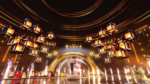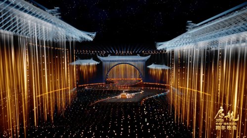 晚会的舞台呈现融合中式美学密码,兼具气势和巧思:蜿蜒的前区延长舞台复刻黄河九曲连环之姿,不仅能够使演员深入观众席进行互动,而且也可使地屏随节目节奏实时变幻黄土沟壑、碧波涟漪等动态场景,营造出“黄河之水天上来”的沉浸式诗境;以中式园林“月洞门”为灵感的背屏,秉持“天圆地方”传统哲思,把吕梁山脉的雄浑肌理和黄河奔涌的壮阔气势浓缩为视觉符号,以此展现自然之美和文化之韵。