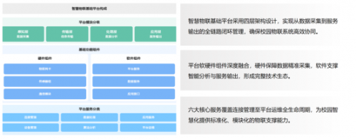 智慧物联基础平台是面向校园场景的物联网能力中枢,通过“四层架构+软硬融合+全周期服务”的设计,实现物联系统的高效协同与闭环管理。它以“感知层-传输层-处理层-应用层”的四层架构为核心,从数据采集、信息传输到智能分析、服务输出,覆盖物联全链路流程;同时深度融合“硬件组件(物联卡、传输模组、通信模块)+软件组件(平台服务、数据服务、应用接口)”,既通过硬件保障数据精准采集,又依靠软件实现智能分析与服务输出,构建完整技术生态。在此基础上,平台以“链接管理、数据处理、应用服务、设备管理、算法分析、平台运维”六大核心服务,覆盖物联网系统从部署到运维的全生命周期,为校园智慧化建设提供标准化、模块化的物联支撑能力。