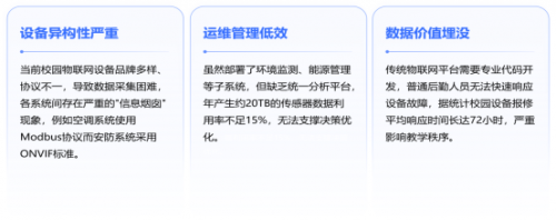 当前校园物联网建设存在三大突出问题:一是设备异构性严重,设备品牌多样、协议不统一(如空调系统用Modbus协议、安防系统采用ONVIF标准),数据采集困难,各系统形成“信息烟囱”;二是运维管理低效,虽部署了环境监测、能源管理等子系统,但缺乏统一分析平台,年产生约20TB的传感器数据利用率不足15%,无法支撑决策优化;三是数据价值埋没,传统平台依赖专业代码开发,普通后勤人员难以快速响应设备故障,设备报修平均响应长达72小时,严重影响教学秩序。