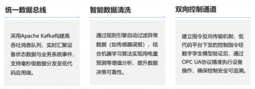 1)统一数据总线:基于Apache Kafka 构建高吞吐消息队列,实时汇聚设备状态与业务系统数据,支持毫秒级分发至低代码应用端,为业务响应提供极速数据支撑。