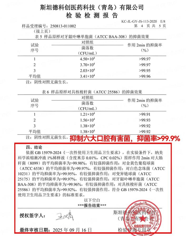 纳美科学浓缩漱冲液系列采用高浓度抑菌配方——CPC与度米芬的双重抑菌体系。经权威第三方检测机构依据国家标准测试,其1%稀释液(含度米芬0.01%,CPC 0.02%)原样在作用2分钟后,对大肠杆菌、金黄色葡萄球菌、白色念珠菌以及口腔常见的变异链球菌、牙龈卟啉单胞菌、具核梭杆菌6种有害微生物均展现出较强的抑制作用。