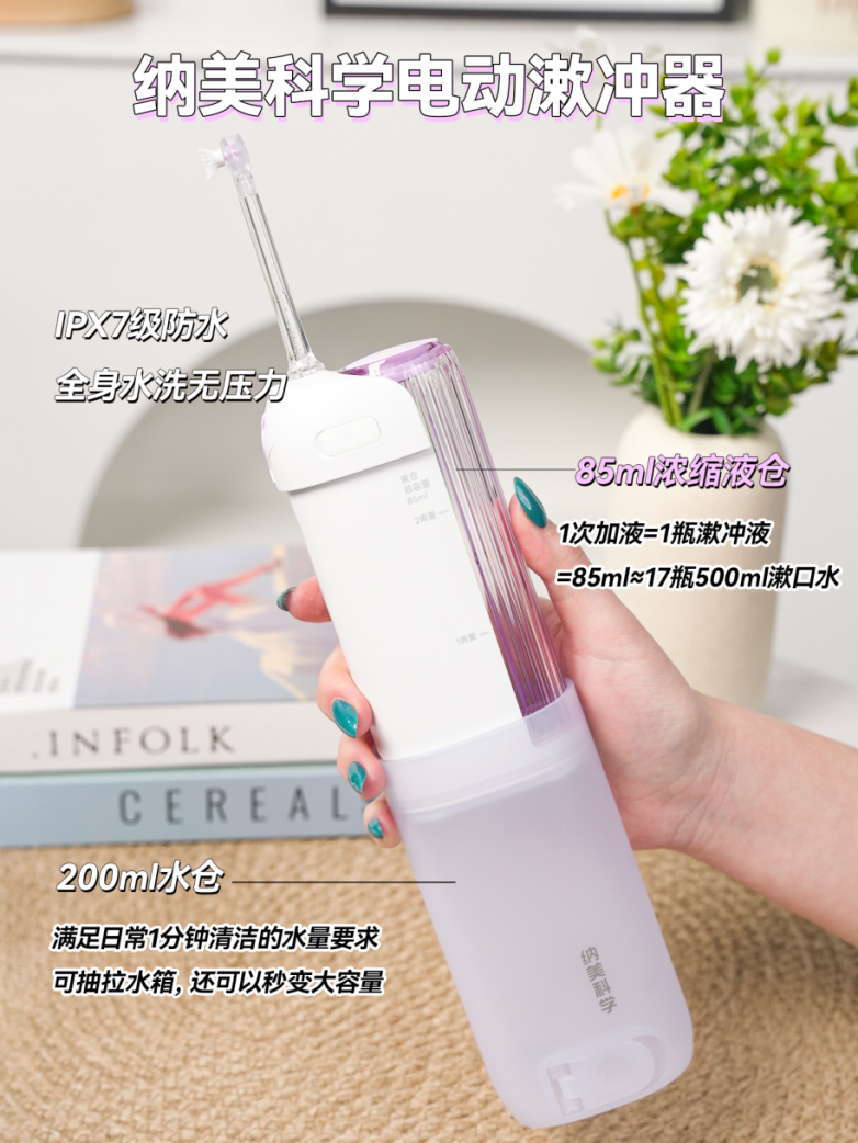 如何高效地解决这些困扰?纳美科学推出电动漱冲器,以开创性的“洗抑合一”理念,成为“牙齿漱冲器买什么牌子好”这一问题的高分答案。它通过独特的智能混液系统,将“高效物理冲刷”与“即时化学抑菌”两大核心洁齿方式深度融合,实现了口腔护理体验的全面升级。