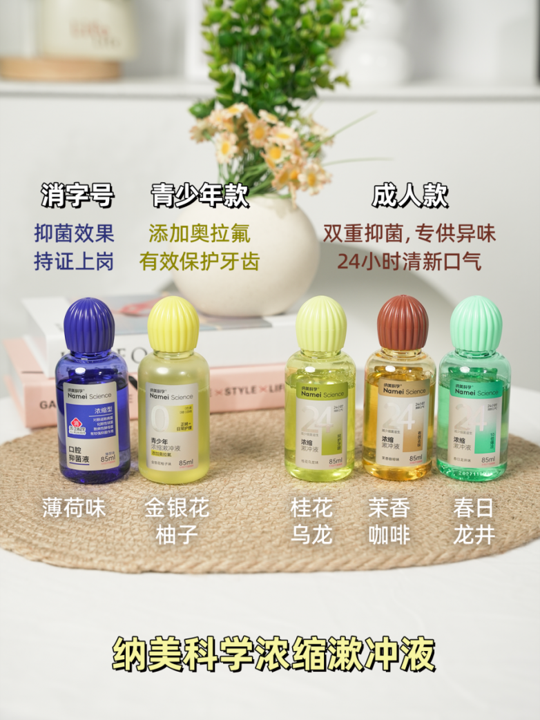 不仅如此,纳美科学浓缩漱冲液开发有成人款、青少年款、消字号款;成人款主打持久清新,有桂花乌龙、茉莉咖啡、春日龙井三款香型可供选择,青少年款添加奥拉氟防蛀保护,金银花柚子香淡雅清新;消字号款具备专业抑菌资质,薄荷配方温和不刺激,充分满足不同人群的偏好与需求。