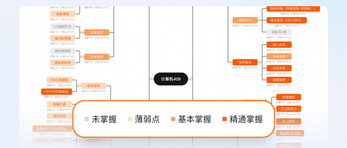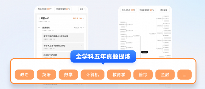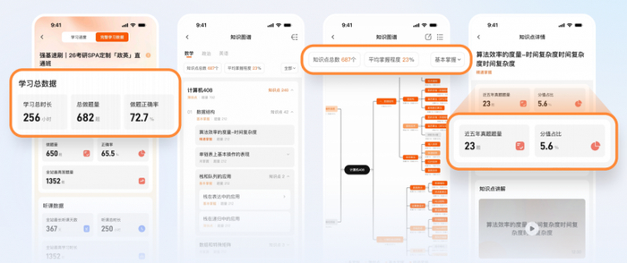 传统备考的痛点是:用户靠"感觉"评估进度,容易自我感动或过度焦虑。SPA 2.0的能力模型全维度追踪课程观看、做题正误、题目耗时等数据,基于学习行为和历史数据预测当前考试分数,点击任意知识点可显示该知识点的做题量、正确率、推荐学习资源。
