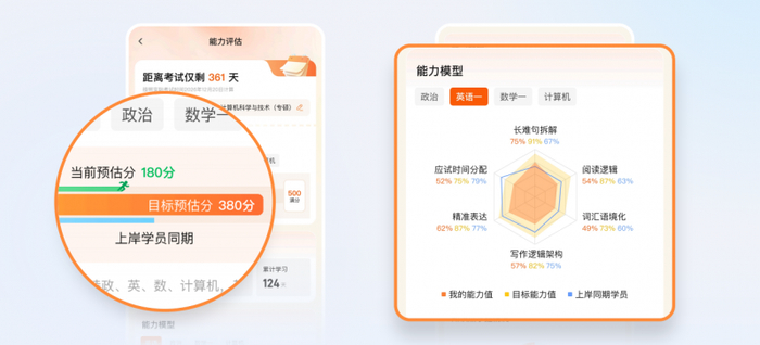 考研的特殊性在于:它是一场"和自己赛跑"的马拉松,但用户需要知道"自己的配速是否合理"。SPA 2.0的同频对比功能匹配"目标院校+专业相同"的上岸学员数据,生成进度雷达图,对比各科目学习进度、薄弱点分布、时间分配。