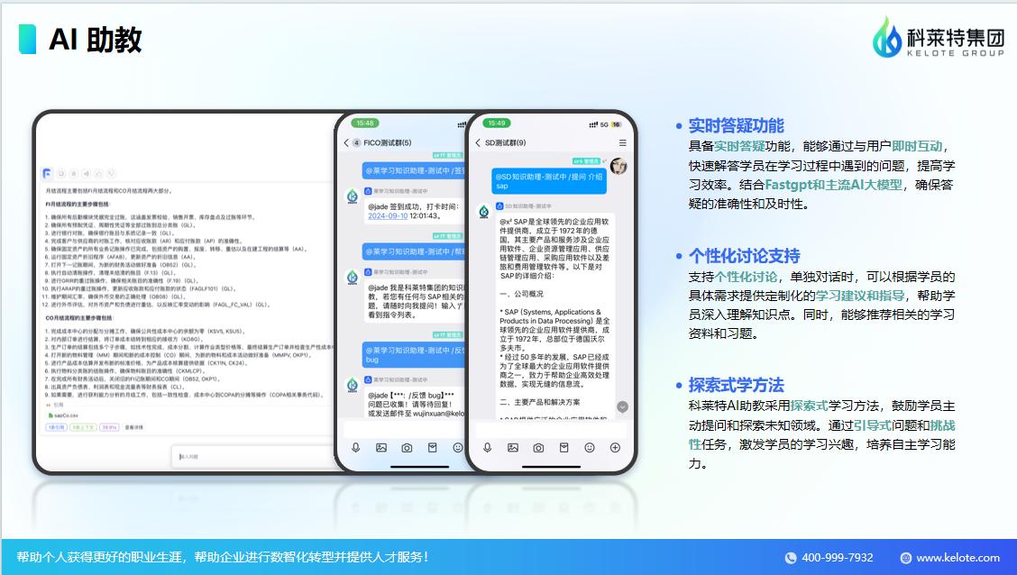 这不仅大幅提升了教学服务的效率与体验,更将传统的在线学习平台升级为“懂行业、懂业务、更懂学员”的终身职业成长伙伴。AI助教能够基于海量项目案例库与实时行业数据,为学员提供情景化、实战化的学习支持,使科莱特“技术+业务”的培养理念得以高效贯彻。