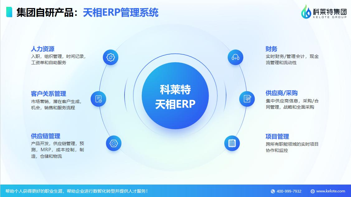 天相ERP是科莱特集团自主研发的一站式智能管理平台,深度整合企业的人力资源、客户关系、供应链、财务、采购及项目六大核心模块。它通过打通数据壁垒、优化业务流程,为管理者提供实时、精准的决策支持,助力企业实现高效协同与智能运营。