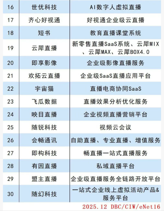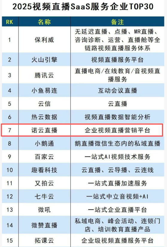 2025年12月30日,德本咨询发布2025视频直播SaaS服务企业TOP30,诺云跻身行业前十,荣列榜单第七位!