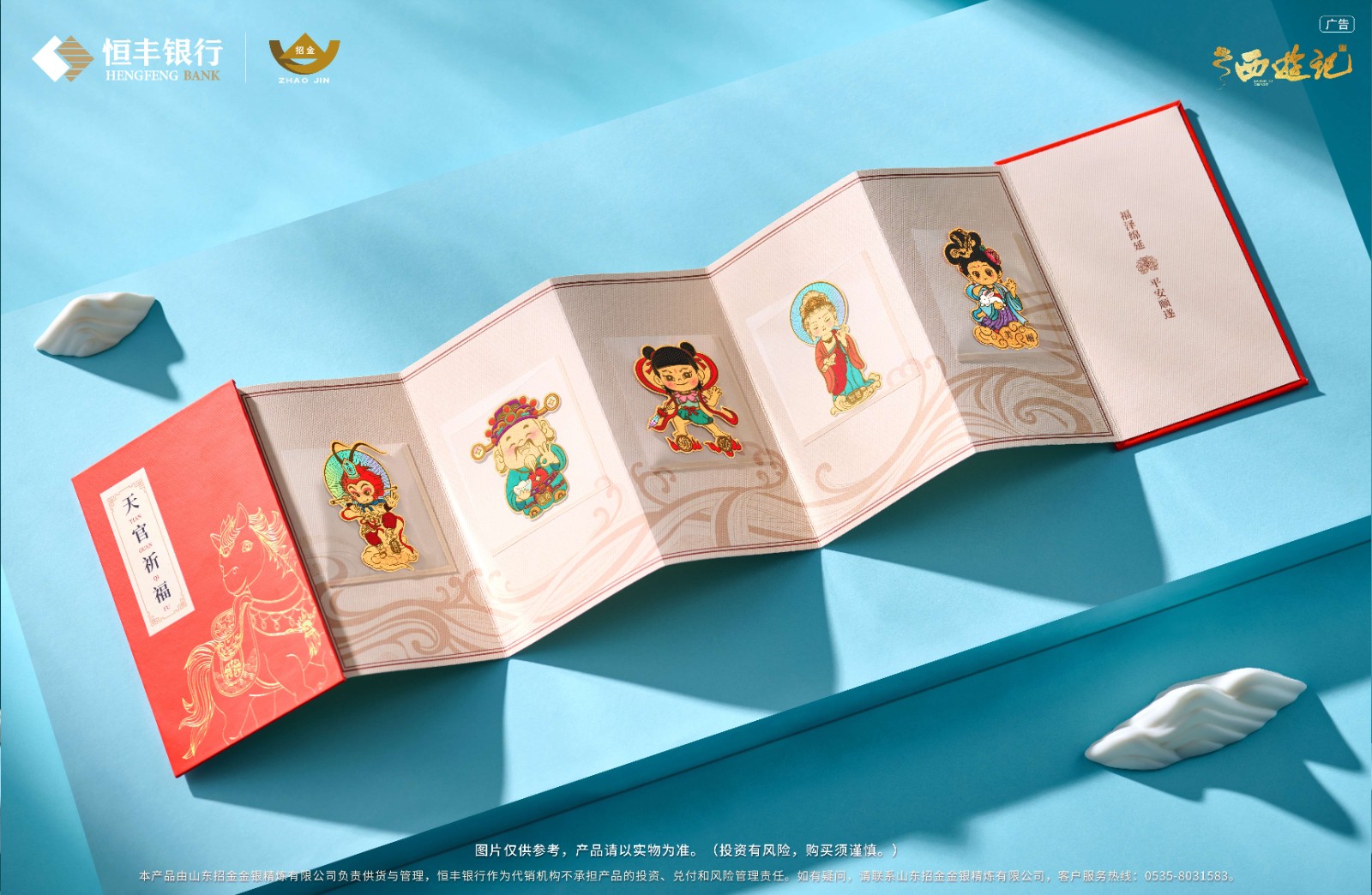 本次恒丰压岁金随产品赠送“天官祈福手机贴”,汇聚《西游记》中广受喜爱的经典神仙角色:代表财福双至、福寿绵长的“福禄寿”三星,象征胜利的斗战胜佛,以及守护平安的观世音菩萨。10位神仙角色以“天官赐福、万事OK”为主题,采用现代溅射金工艺打造,质感出众,熠熠生辉。传统文化赋能现代年礼,为马年新春再添祥瑞氛围。