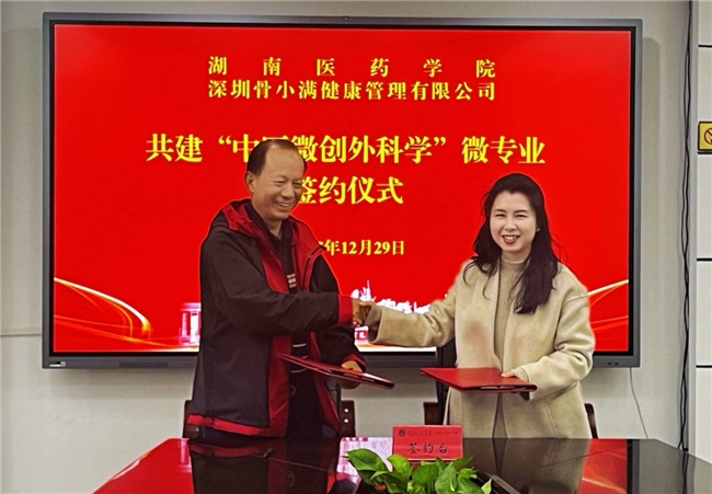 2025年12月29日上午,深圳骨小满健康管理有限公司与湖南医药学院共建“中医微创外科学”微专业签约仪式在锦溪校区至善楼十六楼二号会议室举行。此次合作旨在深化产教融合,整合校企优质资源,培养兼具理论素养与临床实操能力的应用型中医微创外科人才。湖南医药学院党委委员、副校长吴卫华,教务处副处长王林,中医学院院长封敏,中医学院党总支副书记向阳,针灸教研室主任梁莎;深圳骨小满健康管理有限公司董事长曾昭利,副董事长兼技术总裁、河南亚太骨病医院院长王瑞参加签约仪式。仪式由中医学院院长封敏主持。
