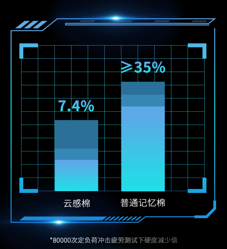 在舒适度上,它能敏锐感知人体体温,随身形自适应贴合,从颈部到脚踝都能被温柔承托,既保持加倍柔软的触感,又能让身体每一寸肌肤都彻底放松、惬意舒展。而在耐用性上,穗宝床垫云感棉与普通记忆棉接受80000次同等抗疲劳压缩测试,穗宝床垫云感棉支撑力变化远低于普通记忆绵,实力证明长期使用不易塌陷与变形。