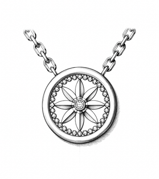 在这座宫苑的万千构件中,瓦当虽小,却是浓缩的美学精粹。诺麟珠宝设计团队深潜杭州市文物考古研究所资料库,在数百件出土瓦当中反复甄选,最终定格了那枚八瓣复瓣莲花纹瓦当。