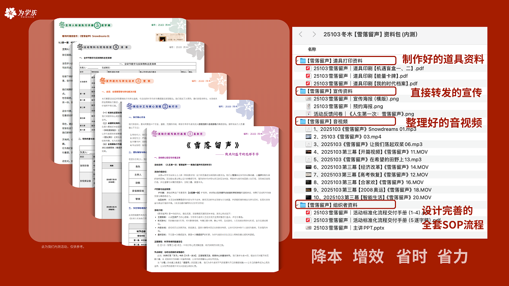 通过岗位分工、现场节奏、物料清单、主持控场与复盘要点等标准化工具,将经验型执行转为流程化交付,提升跨团队、跨场景复用的稳定性,降低组织成本与执行风险。