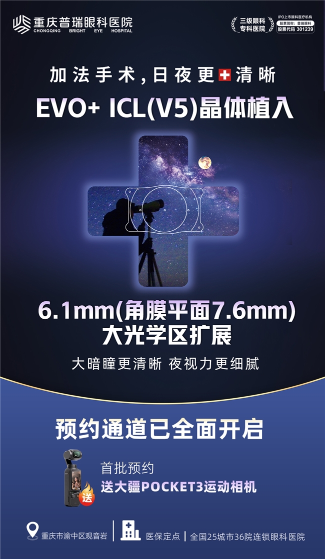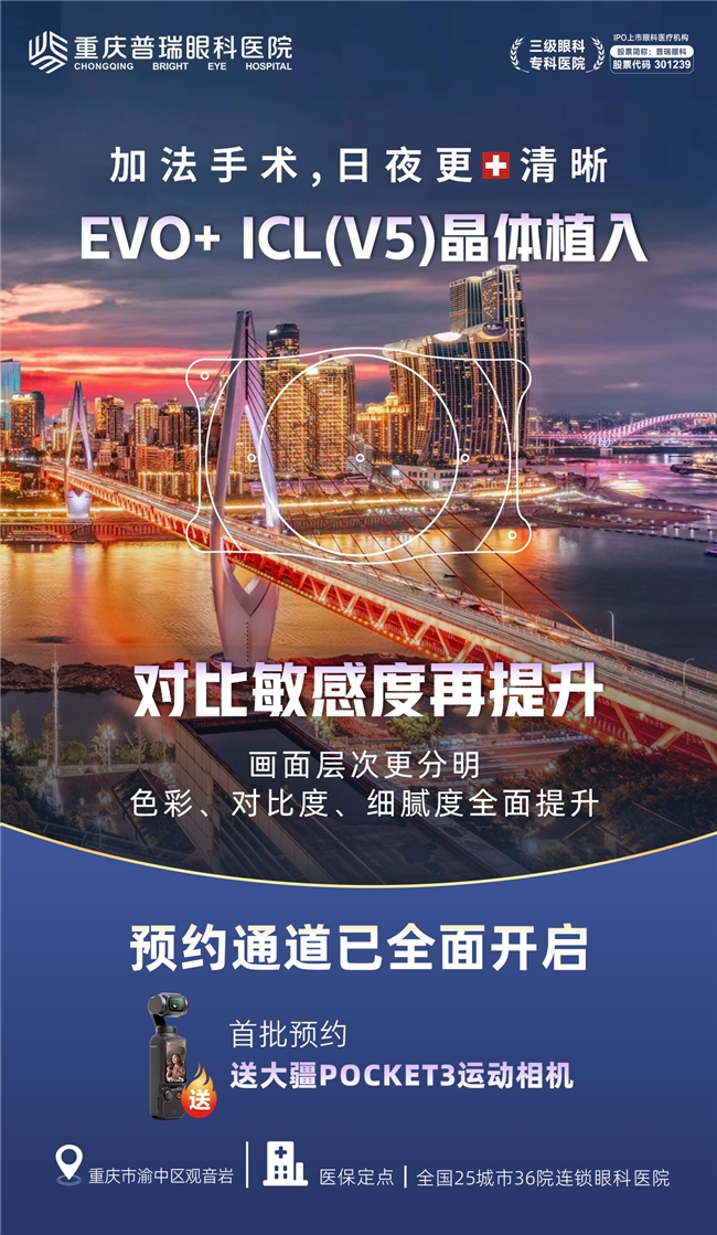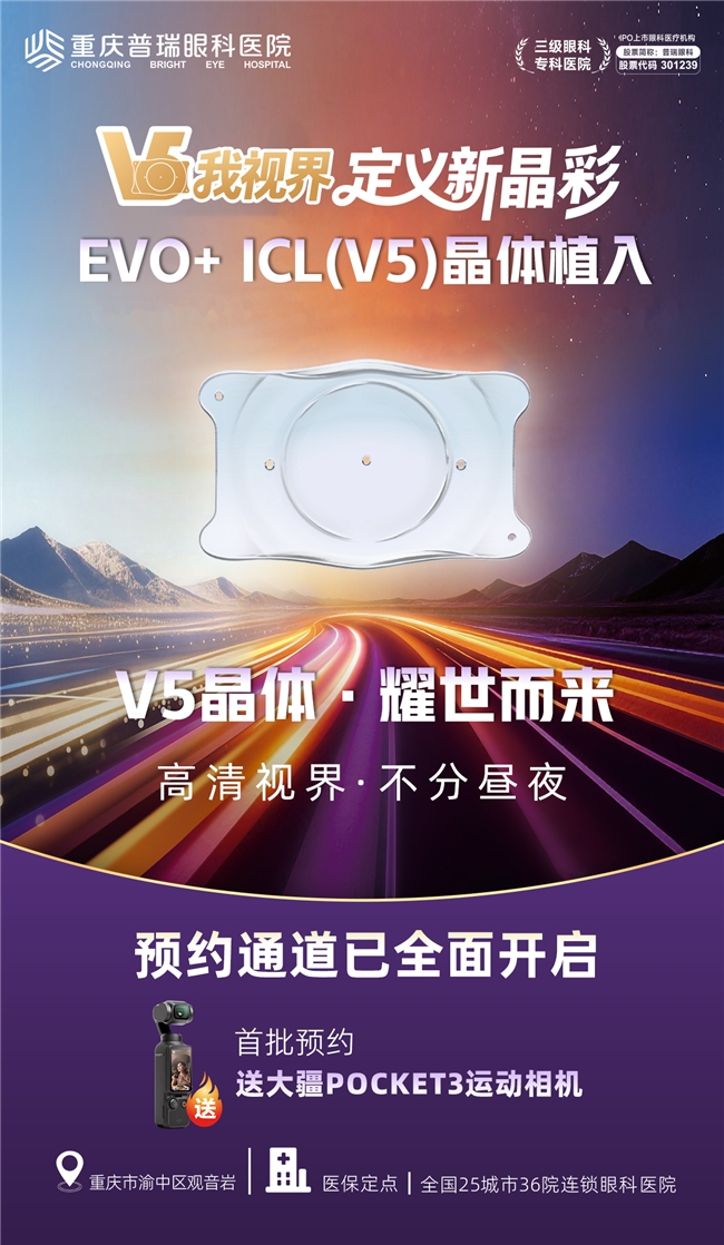 清晰的视界,是享受生活每一刻细节的基础,也是自信面对未来挑战的底气。从EVO ICL(V4c)到EVO+ ICL (V5) ,不仅是晶体型号的迭代,更是屈光矫正理念从“矫正视力”向“提升视觉质量与舒适度”的跃迁,更少的眩光、更佳的夜视力、更宽阔的视觉范围,让世界的细节分毫毕现,让夜晚的灯火温暖而清晰。重庆普瑞眼科医院EVO+ ICL (V5) 首批预约通道开启,将全球前沿的视觉解决方案带到大家身边。清晰,不止于视力表上的数字,更是生活质量的全面升华。重庆普瑞眼科邀请您,一起感受这份更广阔、更自在的“高清视界”。