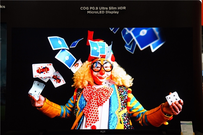 在α-MLED 领域,BOE(京东方)凭借自研高 PPI 巨量转移工艺、低功耗背板技术和高亮度光学微结构等核心优势,进一步拓展在绿色车载显示中的应用空间。其中,首款 COG玻璃基P0.9超薄HDR Micro LED一体机在 CES 现场首次亮相,产品依托玻璃基技术优势,拥有超高清、高亮度、超薄超平、护眼无闪、无缝拼接的特点,10lux环境光下达到ACR对比度≥20000:1,暗态表现出众;旗舰产品 BYH Ultra P0.9,达到20000:1 的超高对比度和 7680Hz 高刷新率;此外,现场还重磅展出了适用于智能座舱系统的30万nits 玻璃基Micro LED PHUD显示和Micro LED全彩木纹隐藏显示展品,具备超高亮度与像素密度,在强光环境下仍清晰可见。