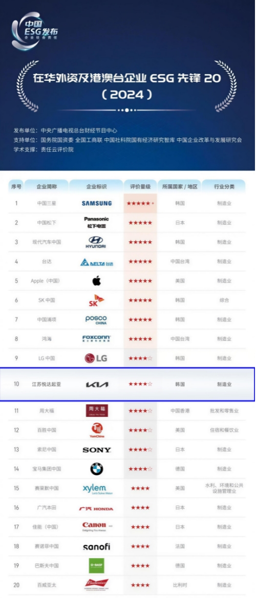 此外,江苏悦达起亚还连续2年入围中央广播电视总台“在华外资及港澳台企业ESG先锋”榜单前10,是榜单前10中唯一在华外资子公司企业。
