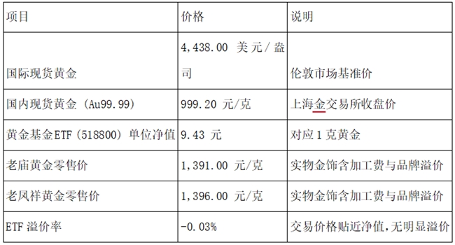 黄金基金ETF(518800)单位净值于2026年1月8日为9.43元,与实物黄金价格高度联动,1克ETF份额对应约1克黄金的实物价值,投资效率显著优于高溢价的实物金饰。
