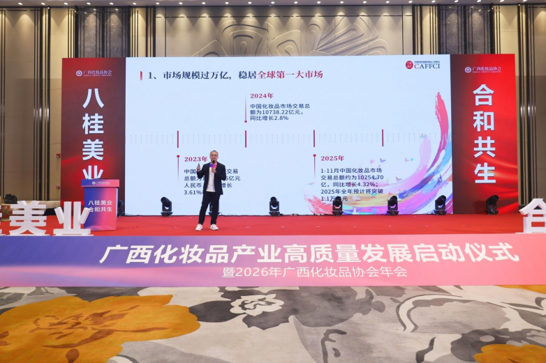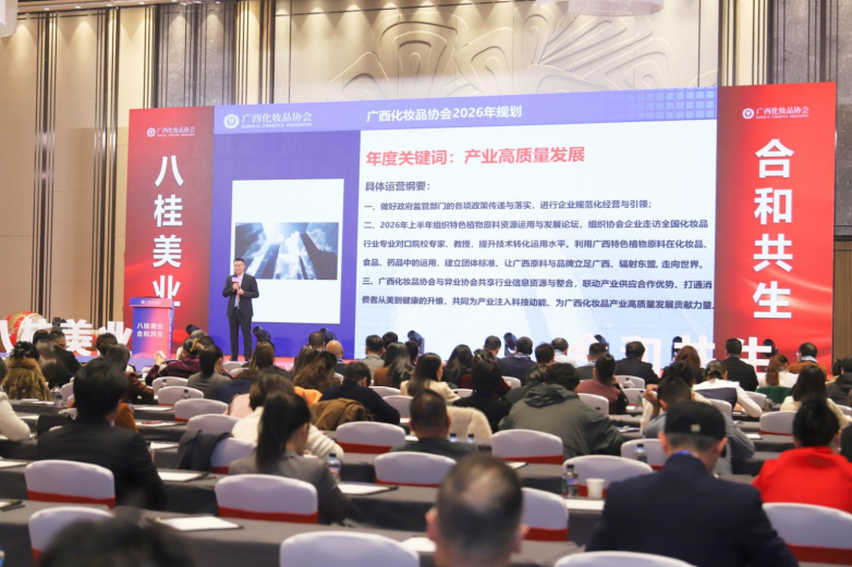 2026年1月7日,在国家“十五五”规划开局起步的关键节点,“广西化妆品产业高质量发展启动仪式暨2026年广西化妆品协会年会”在南宁隆重拉开帷幕。来自全国及全区的500余位行业代表、专家学者、主流媒体与政府职能部门负责人齐聚一堂。