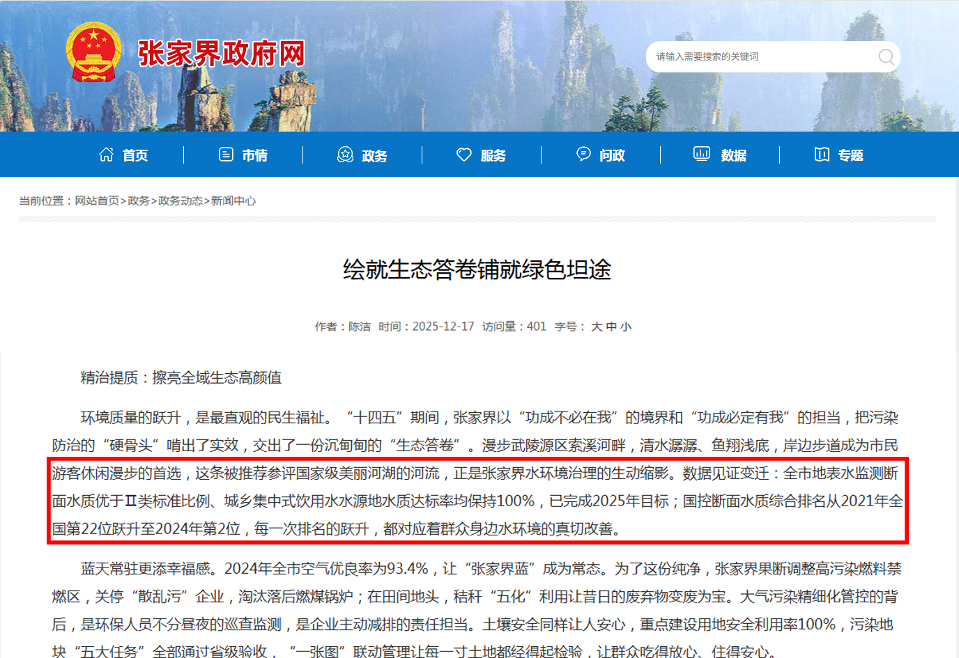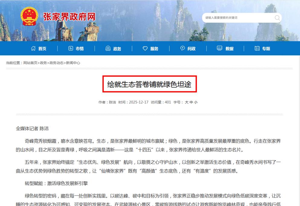 “行走在张家界的山水间,目之所及皆是青绿,呼吸之间满是清新——这是张家界递给世界的生态名片。”近日,《绘就生态答卷铺就绿色坦途》的报道,用一组数据印证了这片土地的生态底气:全市地表水水质100%达标,国控断面水质排名跃升至全国第二。