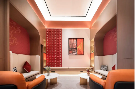 值得注意的是,酒店公区的改造不止聚焦在功能升级,更注重的是氛围的打造。其中,柏曼酒店考虑到休息区所需的隐秘性与温馨氛围,此次改造利用原有布局将休息区设计为半围合式静谧空间,兼顾私密性与温馨感,满足会客与商谈需求。