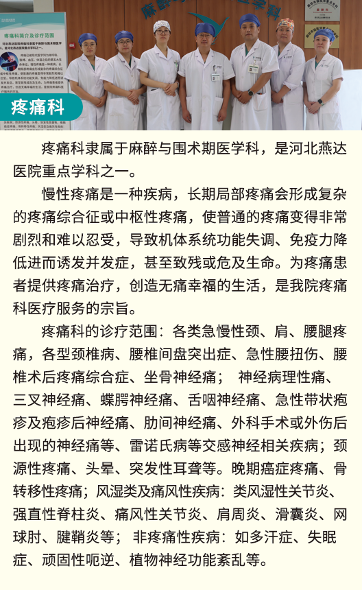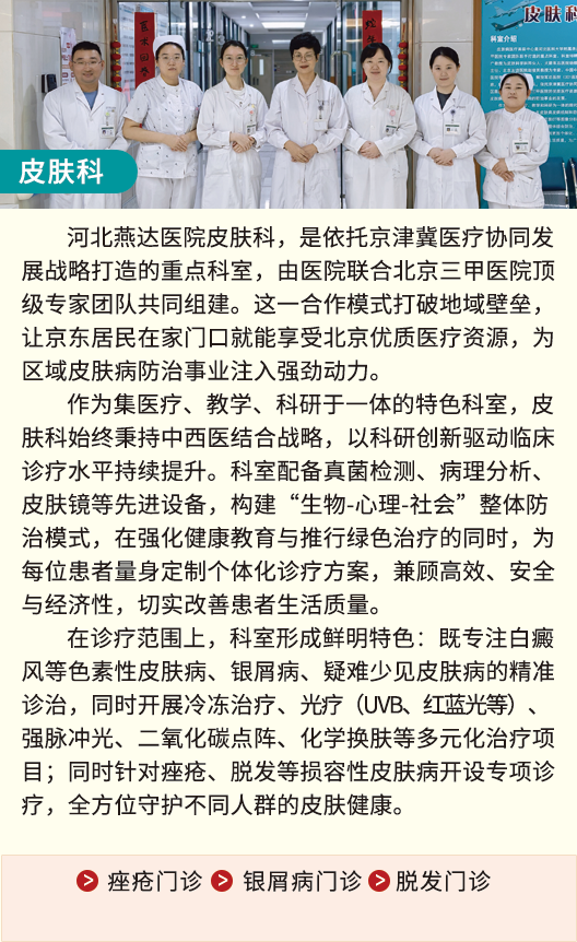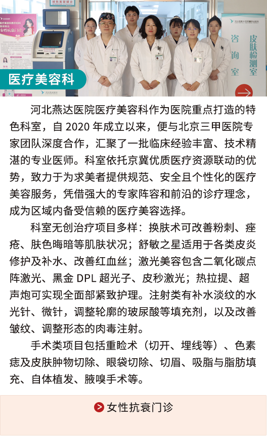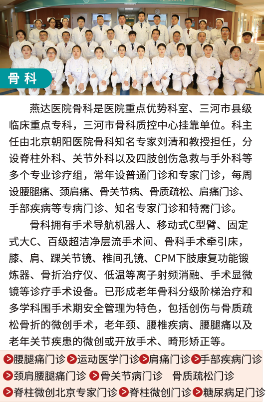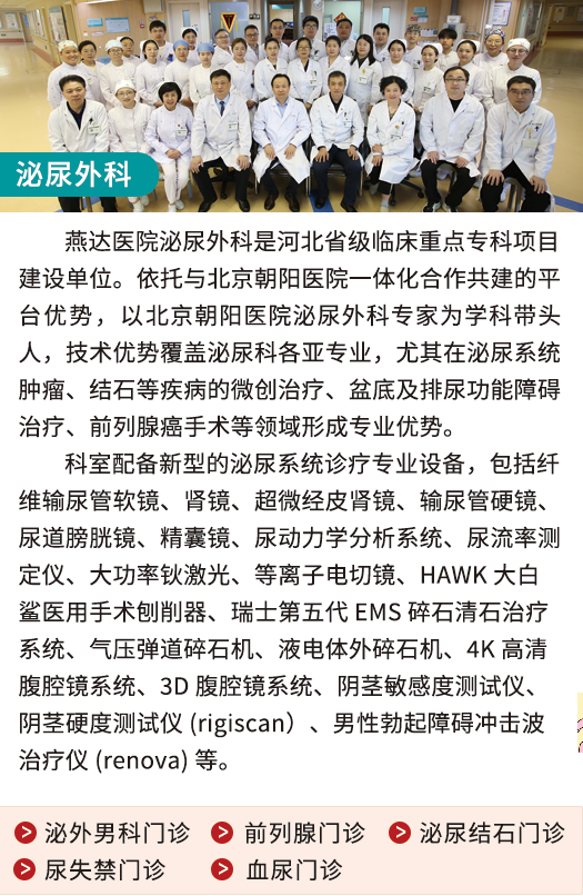 今天,让我们走进燕达医院外科方阵,他们是省级重点专科、市级重点专科——泌尿外科;县级重点专科——泌尿外科、骨科;以及燕达医院优质外科学科——神经外科、普通外科、胸外科、血管外科、皮肤科、医疗美容科、疼痛科等。