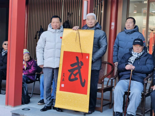 仪式现场,墨香与侠气交融。资深媒体人、北京武协技击专业委员会副主任夏磊,向门惠丰先生赠送墨宝“武”字,一笔一划间,尽展中华武术的精气神;紫竹院太极推手协会会长马小军敬献锦旗——“宛平论剑展太极神韵,刚柔相济承千年文脉”,生动诠释了赛事的文化内涵。
