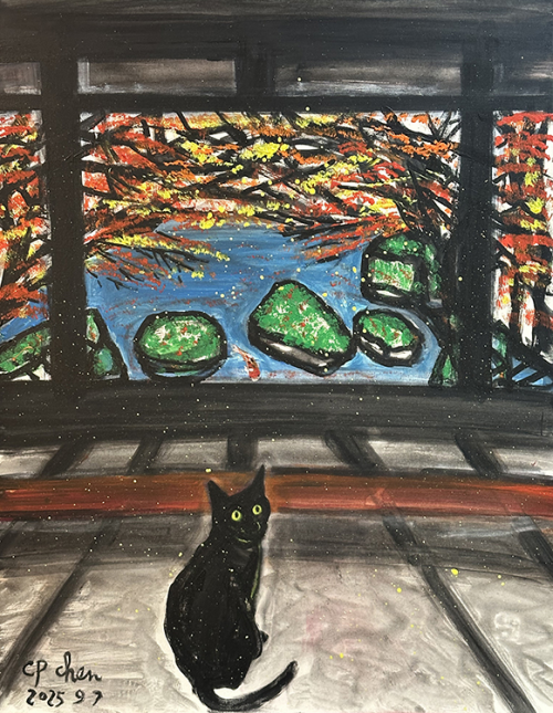以《再回首,我心依旧》为例,画家以玻璃窗这一既能分割空间又可沟通内外的物象为媒介,构建出室外黄叶秋树、静谧池塘、错落苔石与室内窗格倒影拉长、地板灰黑抽象的双重空间,再辅以悠然回首、凝望窗外的小黑猫形象,既为观者拓展了丰富宽广的画面想象天地,又将思绪拉回现实——窗外已然深秋,回眸自顾却“我心依旧”,尽显岁月流转中澄观自守的志节。再如《云上花开》,画家将装饰性紫色荫翳的云团、绿中泛蓝的天空、明艳黄橙的秋菊等原本互不相干的物象,以色彩写实的手法进行造景融合;《一路发》中“一路繁花”的景致、《松鹤延年》里远山劲松与近旁舞鹤的搭配,无不展现出画家由现实景致向精神层面艺术升华的画面时空构建能力。从审美的观点看来,均有生命与精神的表现。细品陈持平的这些画作不难发现,画家以“生命与精神”为创作内核,以色彩为媒介塑造画面形象、构建画面空间,真正实现了“以彩为兴造境,沟通时空寄情”的艺术追求。