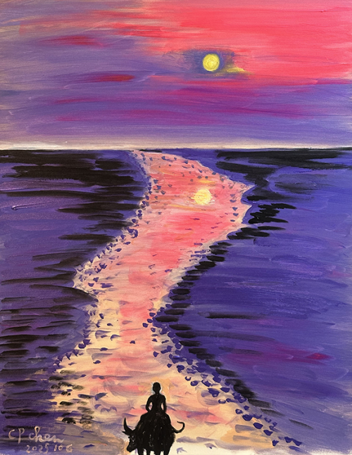 色彩,是绘画造景立象、创造美感的重要媒介,亦是塑造形象、传递情感的有效路径。欣赏《秦时明月汉时关》《在水一方》《秋天的新娘》《希望》等丙烯作品可见,陈持平以鲜艳夺目、契象得体、丰富多样且协和统一的色彩语汇为调和之媒,借由起兴表象、着意造景的创作手法,使画作极具视觉冲击力,令观者映目会心,进而唤起内心的情思共鸣与精神契合。这既展现出画家精准捕捉朗澄明月、长城烽燧、落日余晖、水岸牧归、艳冶秋光、烂漫草木、初阳晨曦等自然与人文现实景致的敏锐洞察力,更体现出其深挖这些景致特征,并以“随类赋彩”之法进行本质开掘与艺术构建的创作功力。同时,画家立足中国文化的诗境审美意象,融西画色彩、光影等语言元素于创作之中,以体用互参、形意相和的理念,赋予画面动人的形象美感。