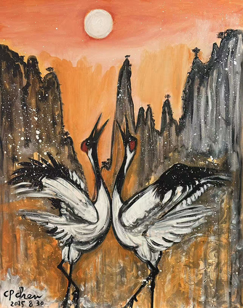作为视觉艺术,丙烯画创作中画面空间的构建至关重要。它不仅需要满足观者视觉体验中物象空间远近、大小的感知需求,更要契合情感、想象等精神世界的意象表达。陈持平的《再回首,我心依旧》《云上花开》《松鹤延年》《一路发》等丙烯作品,或采用超出自然现实却符合视觉规律的远小近大焦点构图,或运用超越时空界限、不拘泥于客观距离却契合精神意象表达的“得其象中”空间造景手法,均彰显出根植于画家内心深处的文化学养与审美内涵。