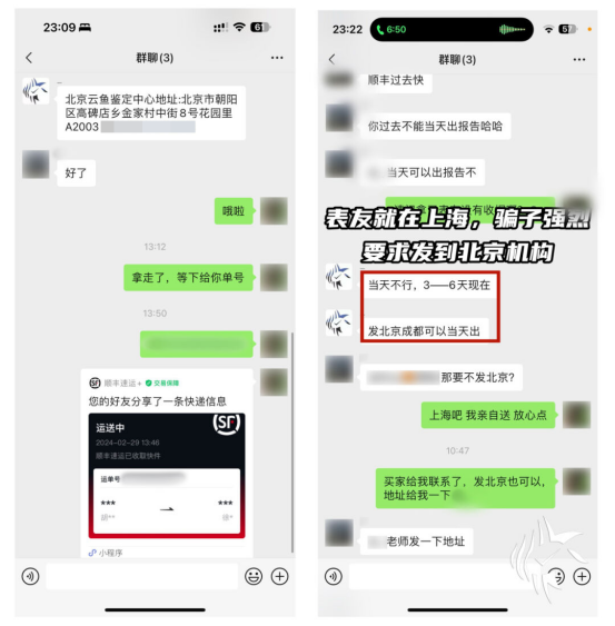 我们查看群聊截图后发现:该群非企业微信建立、群内“云鱼工作人员”无实名认证,是典型的诈骗团伙伪造群组。骗子以上海“鉴定积压”为由,诱导表友改寄北京,企图通过地理距离拖延时间、阻碍追回。