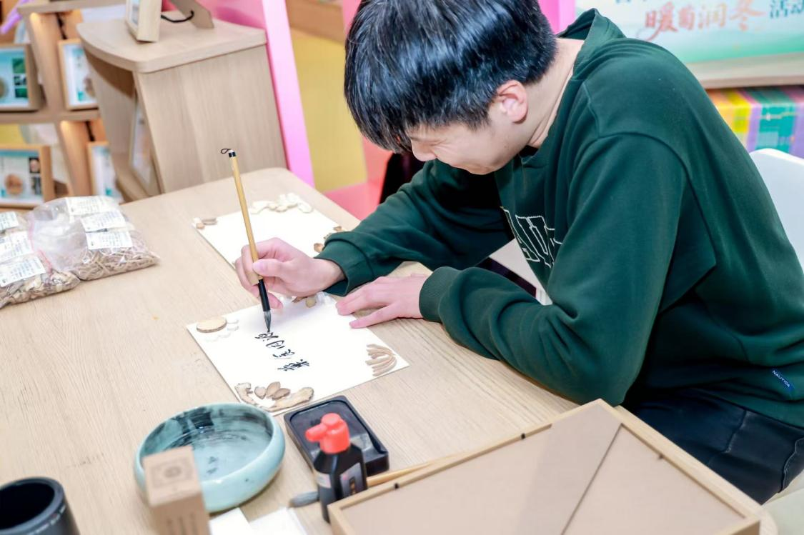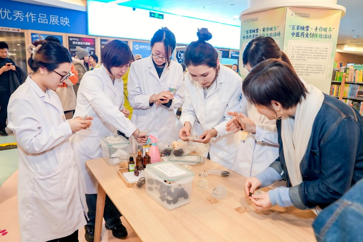 “手作暖冬”文创体验区前排起了热闹的小长队,大人小孩齐动手,在工作人员的细致指导下制作中药香牌。工作人员全程耐心解答市民关于香牌原料选用、日常储存、搭配使用等疑问,让大家亲手将养生理念与传统文化具象化,把独一无二的中药香牌带回家。