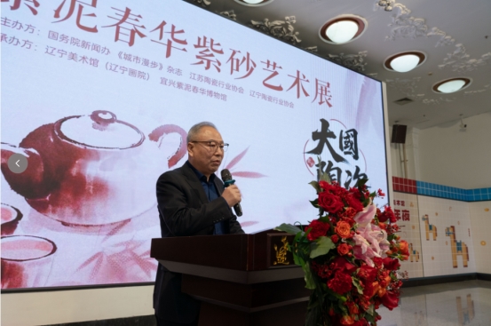 江苏宜兴市市委宣传部二级调研员齐永明、辽宁省著名艺术家秦志顺、中国世界民族文化交流促进会文旅与数字影视工作委员会常务副主任兼秘书长孙世泓先后登台致辞,分别从地域文化交融、艺术创作传承、文旅数字赋能等维度,探讨紫砂艺术的时代价值与发展路径,寄语两地以文化交流为纽带,推动传统工艺焕发新生机。